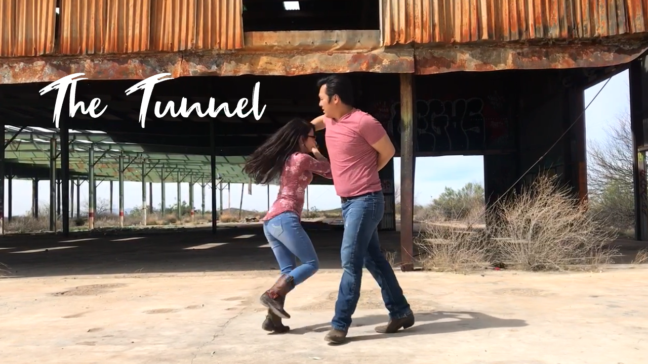 - Next, with your right arm you’re going to start an Inside Turn with your right arm. Draw your elbow toward the sky, and this initiates the tunnel. Step on your left foot and rotate CCW–this helps the follow clear the tunnel effortlessly. Follow through with a right step to the right as you draw your left elbow toward the sky to make the Tunnel passage on the other side. Rock back on your left foot afterward.