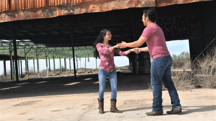 The Crossed Arm Slide is one of the easiest ways to get into a cross-handed position. The leader guides the follow to loop her arm over her head while he does the same, then they slide off to a right-to-right hand hold.