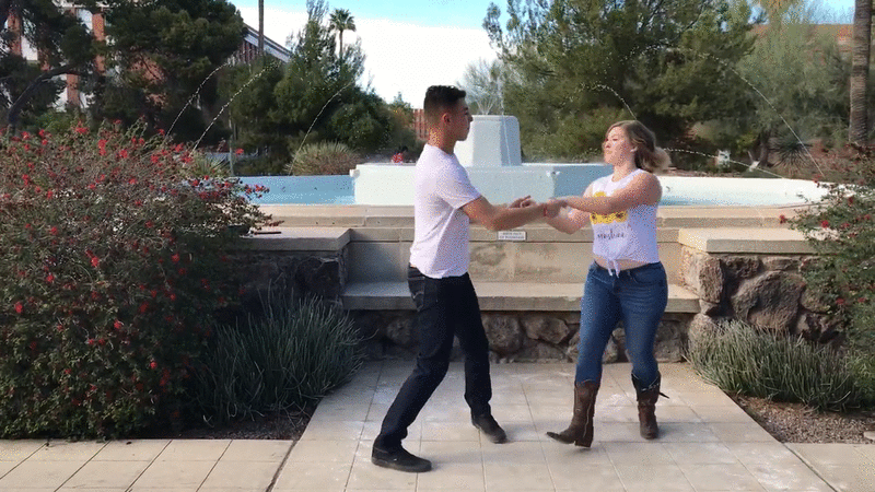 The Crossed Arm Slide is one of the easiest ways to get into a cross-handed position. The leader guides the follow to loop her arm over her head while he does the same, then they slide off to a right-to-right hand hold.